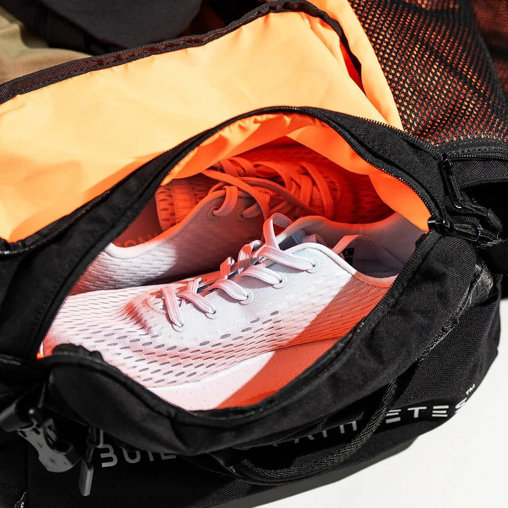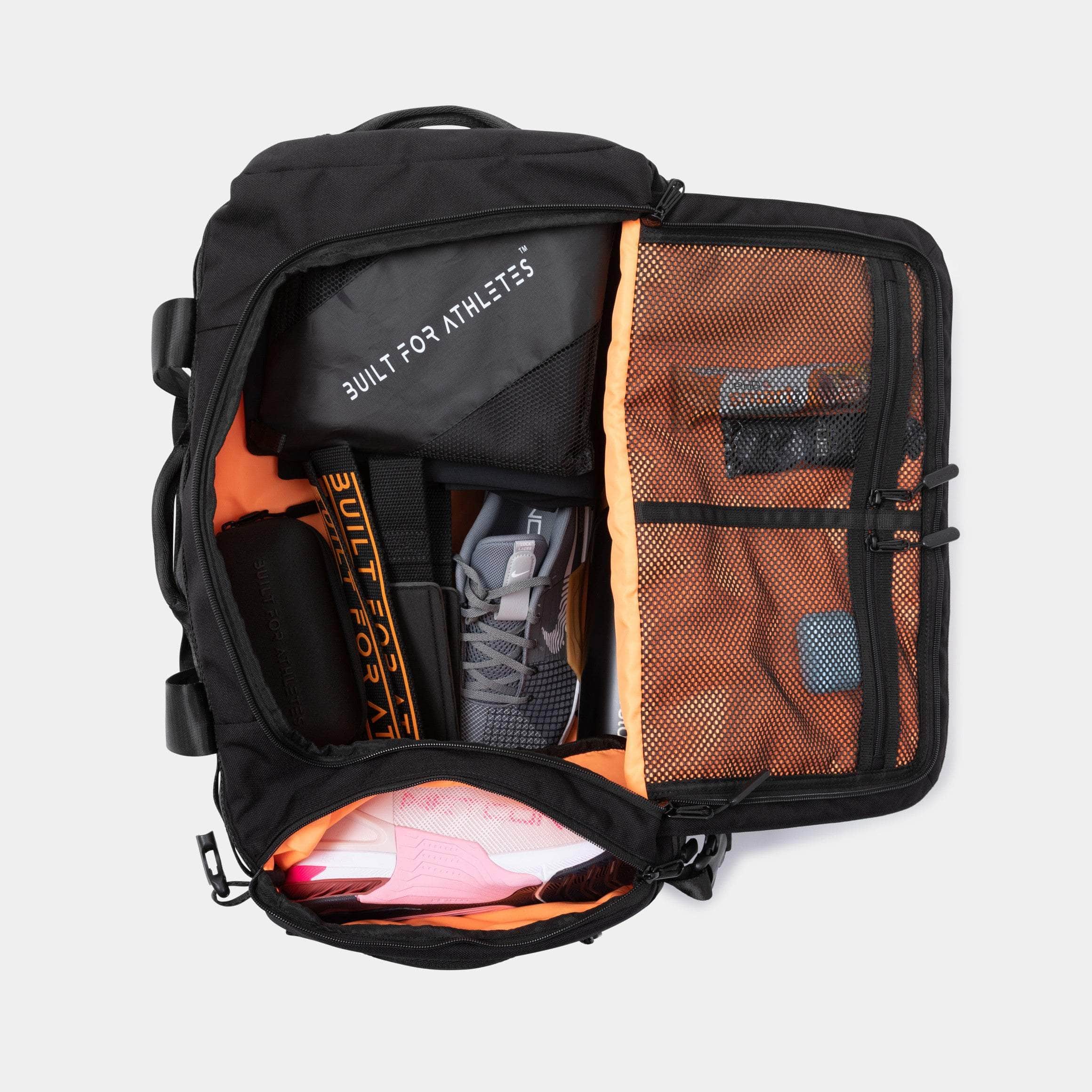 Passt: 2 x Paar Schuhe, 4 x Outfits, Necessaire, 17'' Laptop, Hebegürtel, großes Handtuch, 2 x Mahlzeit, Zubereitungsboxen, Getränkeflasche, Proteinshaker, Waschbeutel, Handgelenkbandagen, Knieschoner, Springseil. Imbisse